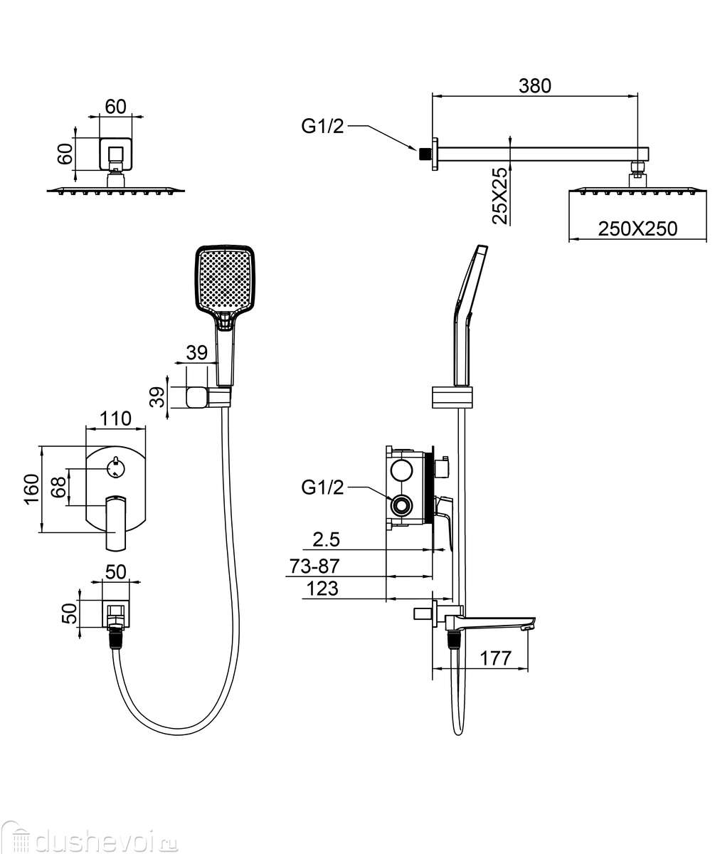 Габариты верхнего душа: | 250 |